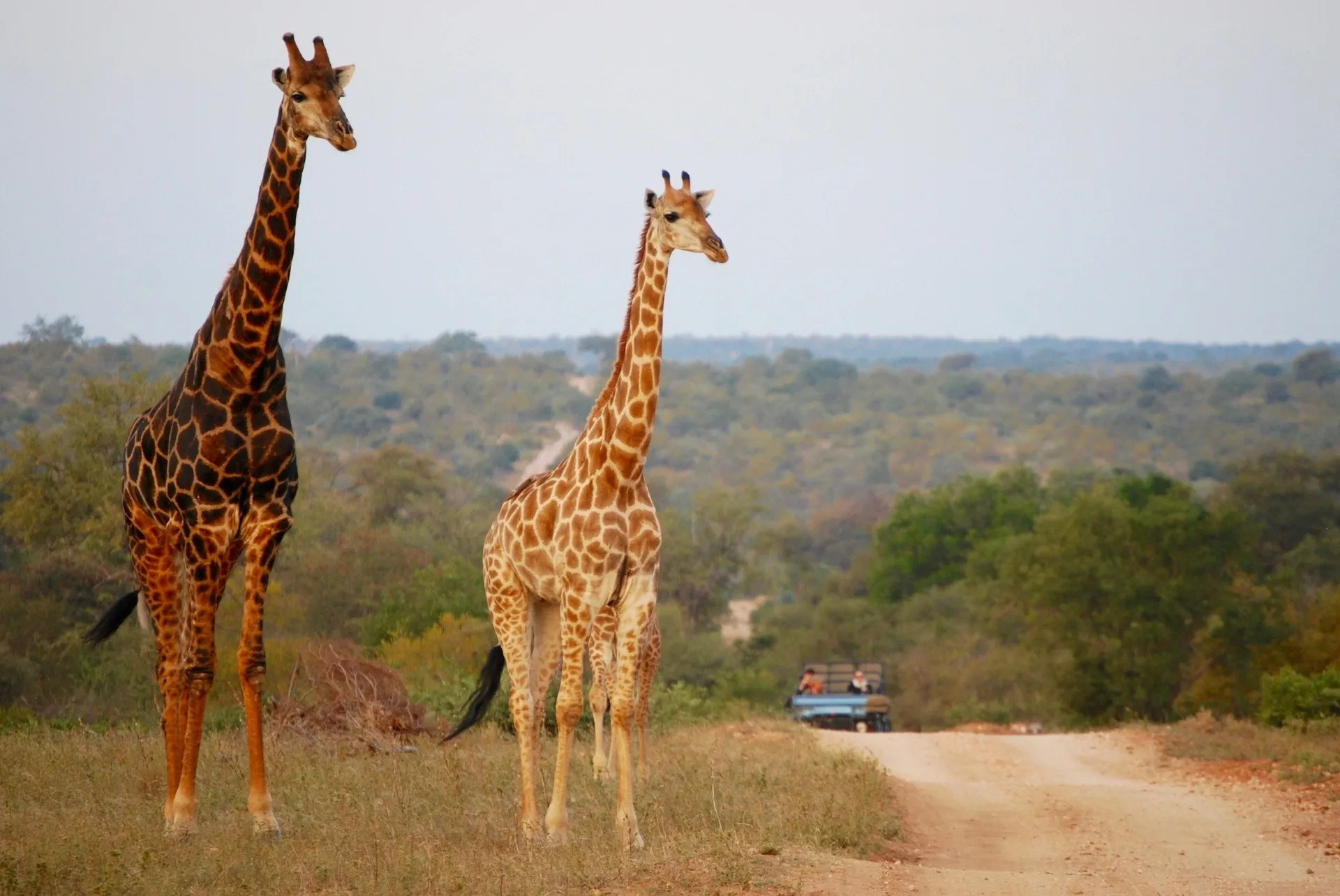 Amidst the golden hues of Kruger National Park, a scene unfolds that feels like a dream brought to life. Giraffes stride gracefully across the road, their towering silhouettes brushing against the sky, their striped patterns blending perfectly with the untamed wilderness.